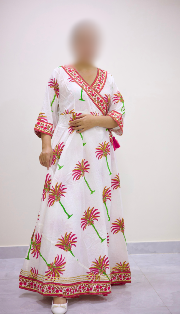 تألقي بأناقة ناعمة مع هذه الجلابية الهندية المصنوعة يدويًا من قطن نقي 100%. تتميز بتطريز فاخر ونقوش نخيل باللون الوردي تمنحك لمسة فريدة من الأناقة الشرقية. تصميم مريح وواسع مثالي للمنزل أو المناسبات الخاصة.